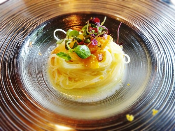 通常のパスタの1/3ほどの細さのパスタ。カラスミがかけられ、上質な大人の味に仕上がっています。