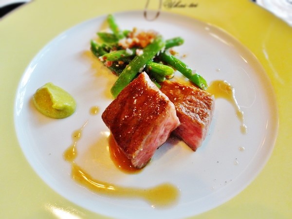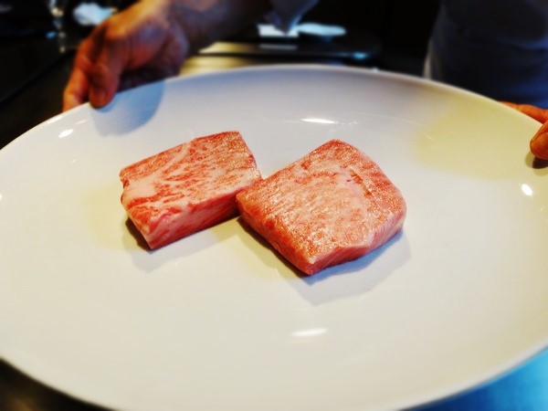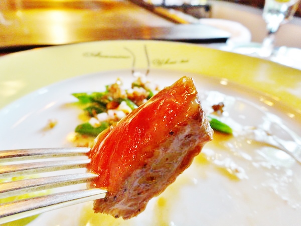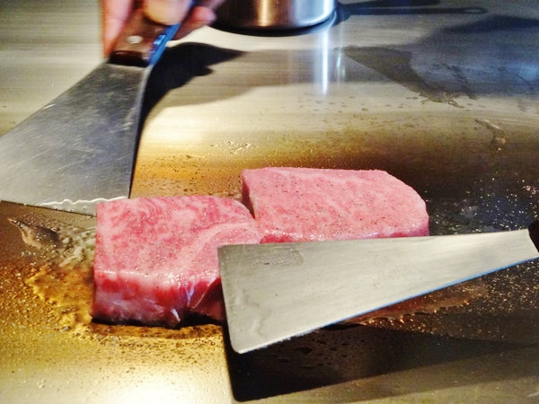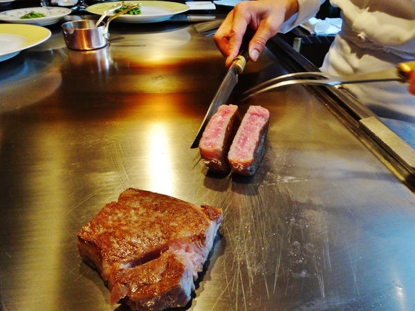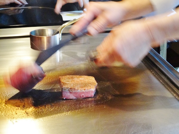 マエストロが目の前の鉄板でお好みの焼き加減で焼いてくれます。今回ももちろん「レア」でお願いしました。