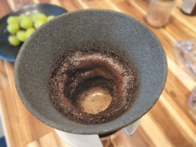 今回の2枚目は煮沸後に抽出が速くなった感動の瞬間を撮影したものです。湯が線で落ちるようになり、粉層もふんわり。点滴状の停滞が解消し、ストレスのないドリップに戻りました。