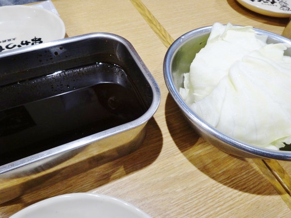 入店後、さっそく運ばれるのがキャベツとソース!もちろんキャベツも二度漬け禁止ですよ!!