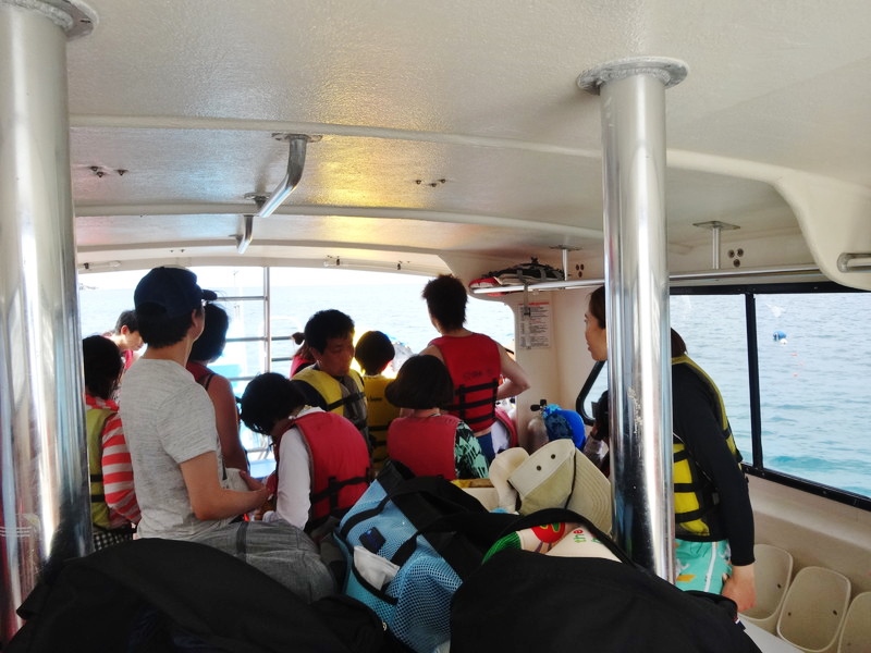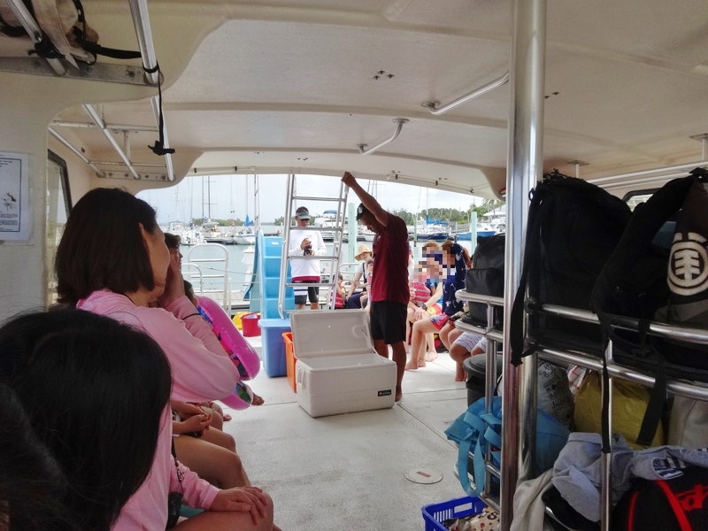 船内では出発前に注意事項やサービスについて日本語で説明があります。ちょいちょいジョークを交えるので船内のテンションもMAX!子供たちも大喜びです。