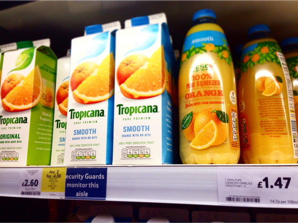 紙パック(トロピカーナ)のものが2.6ポンド338円。ペットボトルが1.47ポンドなので191円です。