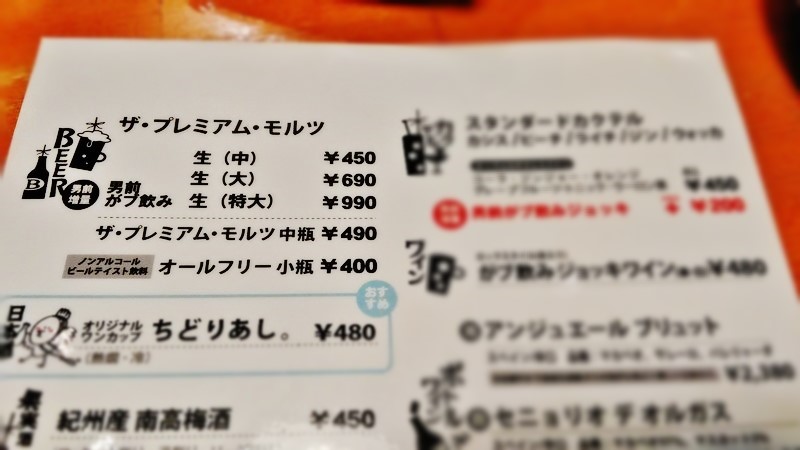 生ビール(中)なんて1杯で450円ですから、2杯飲めばこれだけでほぼ元が取れてしまいます。しかもプレミアムモルツですからね。いや~素晴しい!