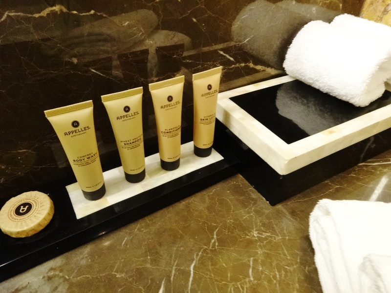シャンプーやリンス類も綺麗に整列しています。高級ホテルだとこういう演出もテンションがあがりますよね!?