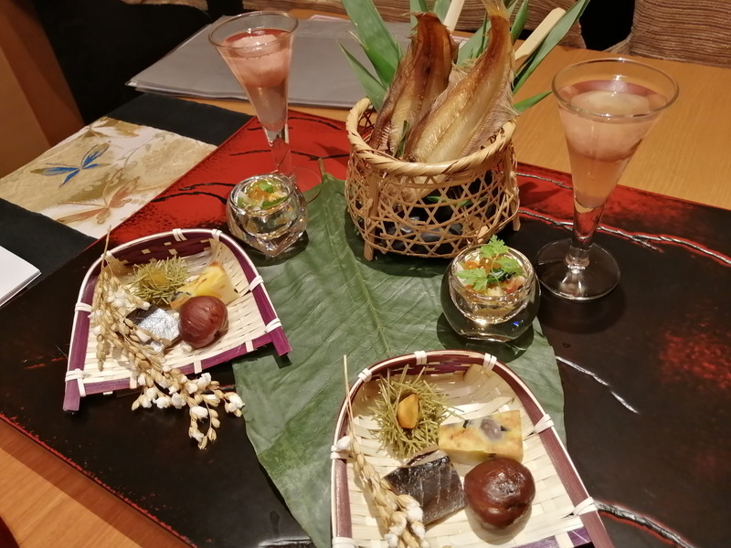 こちらは前菜2人前です。鰈の風干し、秋刀魚の燻製、実り稲穂など目にも鮮やかな彩りです。