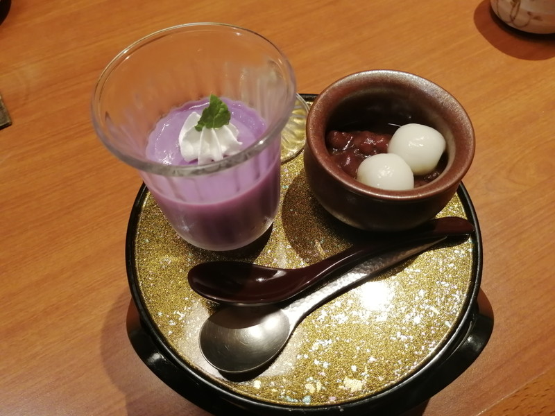最後にデザートの水菓子「紫芋ムース」と「白玉ぜんざい」です。