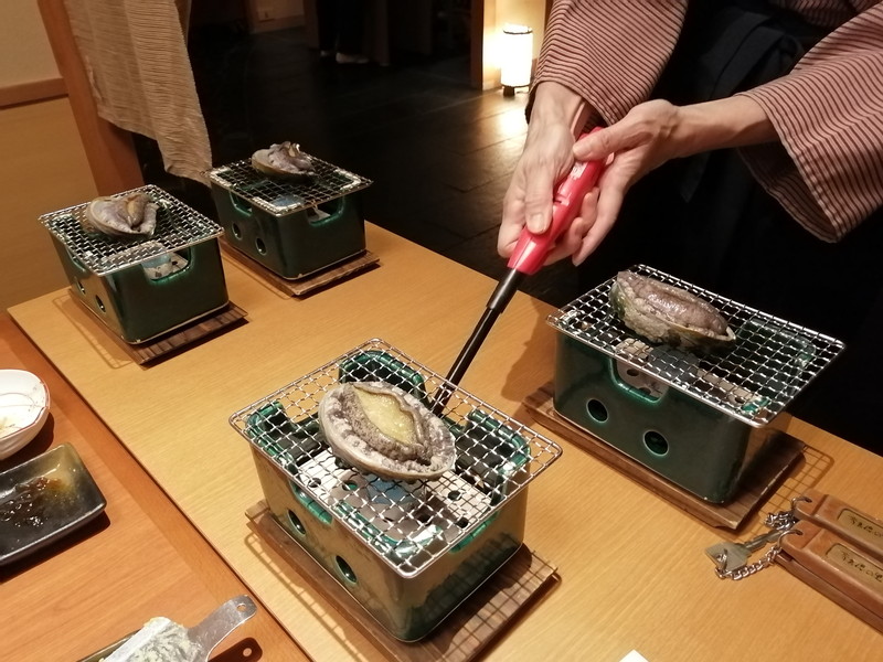 続いて「黒あわびの踊り焼き」ですが、目の前で焼かれる鮑は新鮮そのもの。刺身でも頂ける鮮度です。