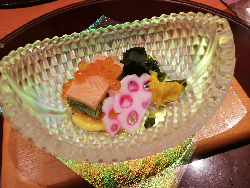 サーモンといくら、蓮根の色鮮やかさも素晴しいですね。器も目をこの一品を際立たせる物ですばらしい!