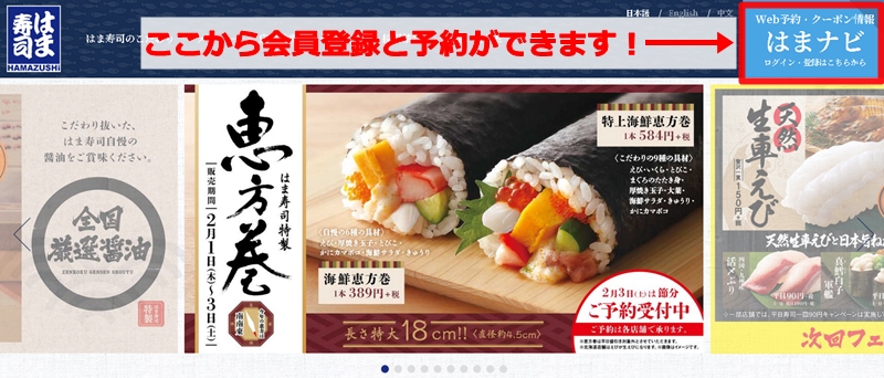そんな中、はま寿司にはWEBで予約できるサービス「はまナビ」があるんです。無料の会員登録は必要ですが、簡単に予約できて待ち時間も少ないです。通常、お店に行ってから席の発券を行いますが、WEB予約なら予約時間に行けば次に席が空けば案内されます。