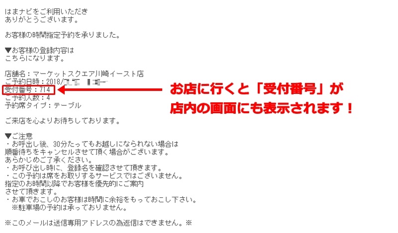 予約が完了するとこんな確認用メールが届きます。予約時間が近づいてくると「予約番号」は店内の案内画面にも表示されます。