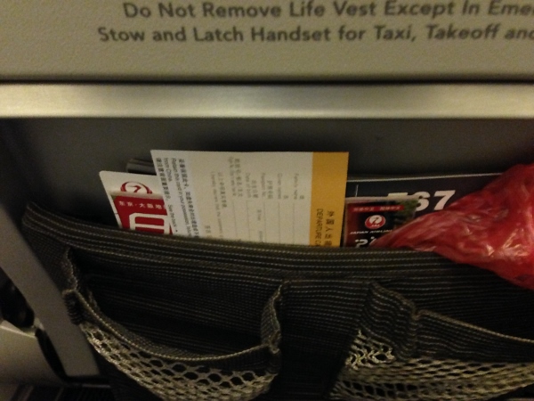 座席の前には中国の入国カードが挟まっています。離陸前に記入してしまいましょう。