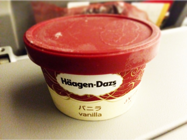 少し時間を置いて、デザートのハーゲンダッツが配られましたよ。