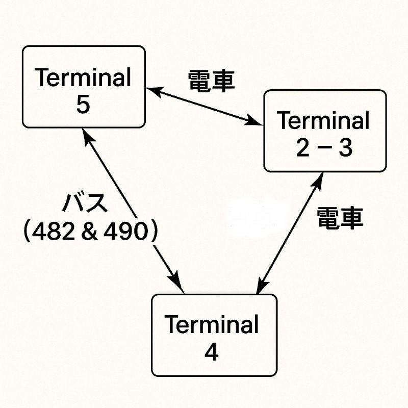 この記事では、誰でも迷わず・追加料金ゼロでターミナル間を移動できるよう、交通手段の特徴からチケット発券方法、所要時間の目安、移動に役立つ小技までを徹底的にまとめました。