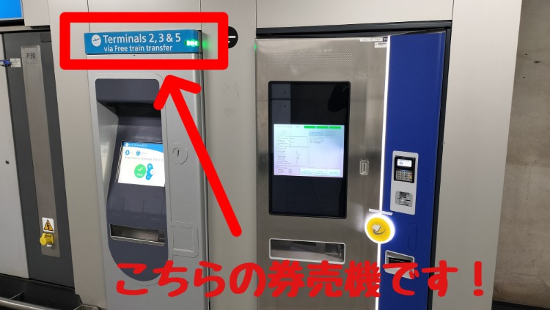 到着ロビーに設置された青い発券機で「Free Terminal Transfer Ticket」を発券し、改札に通せばOKです。