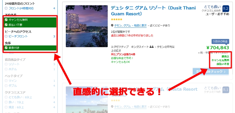 それはこれまで書いてきた「前払い不要」「キャンセル料無料」のホテルを簡単に選ぶことができるからなんです。しかも直感的に操作できるサイト設計になっているので、初めてでもサクサクとホテルを選ぶことができますよ。