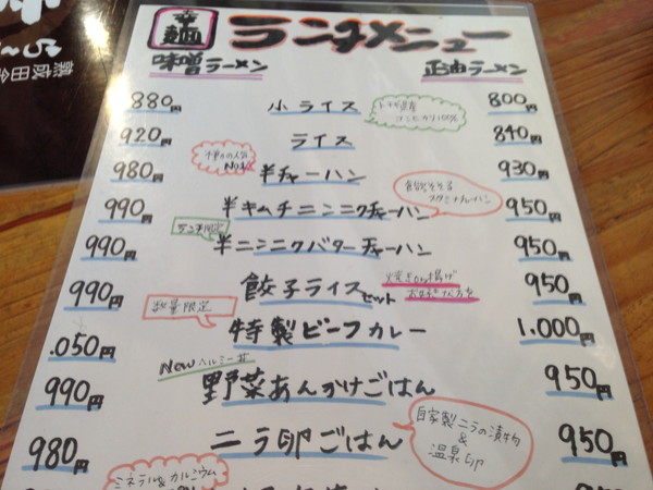 基本の「味噌ラーメン(730円)」「醤油ラーメン(700円)」に各種組み合わせがあります。