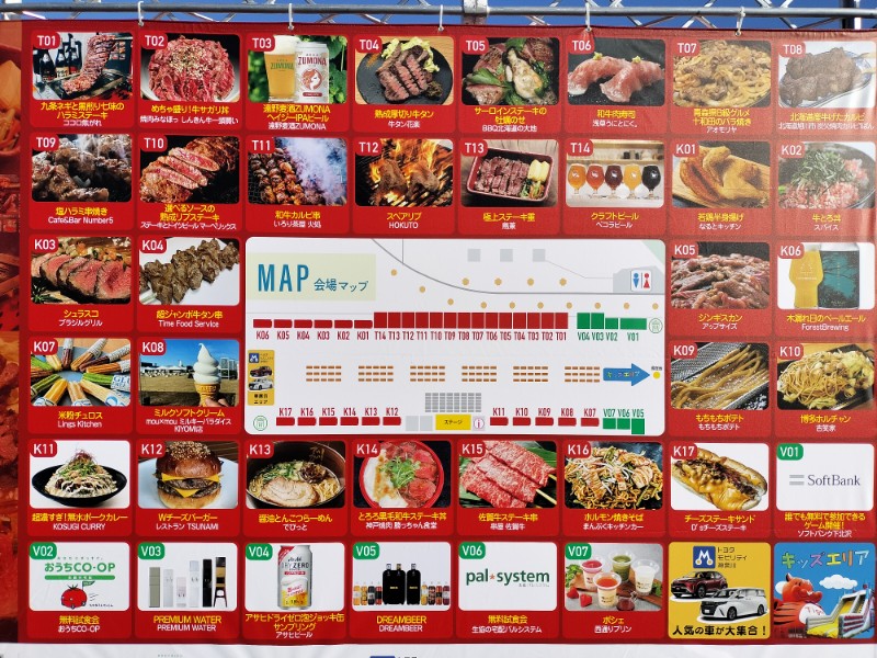 ・入口から右回りで肉ゾーン→ビール→ステージ→キッズエリアと巡ると最短で一周可能。