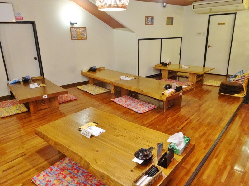 店内には靴を脱いで上がります。ズラーっと板の間にテーブル(座敷)が並んでいます。17:30の予約は最初のお客さんだったようで一番乗りでした。
