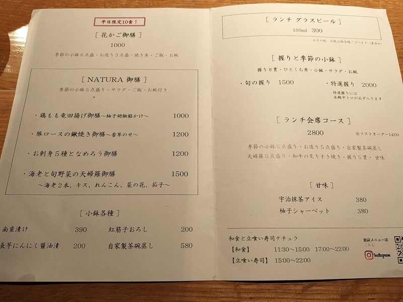 ランチのメニューです。人気は平日限定10食の「花かご御膳(1000円)」だそうです。