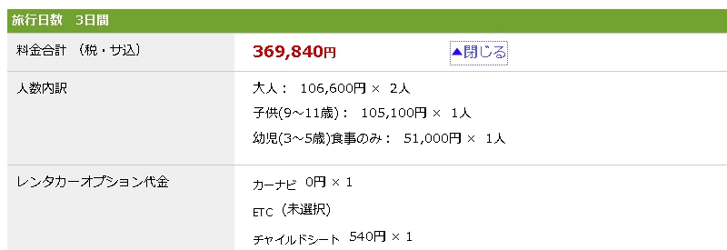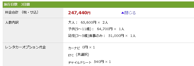 前提条件として下記のプランで検索してみました。イメージとしては家族4人の夏休みの沖縄旅行です。日程は8月1日~3日の2泊3日。