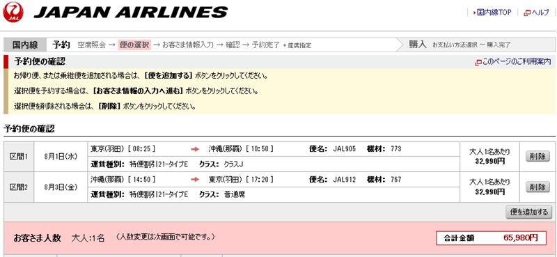 ちなみに同じ便を日本航空(JAL)のホームページで検索してみると・・・。