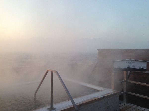 こちらが朝の露天風呂の写真です。湯煙で隠れていますが、ピンと張り詰めた空気に絶景と温泉。