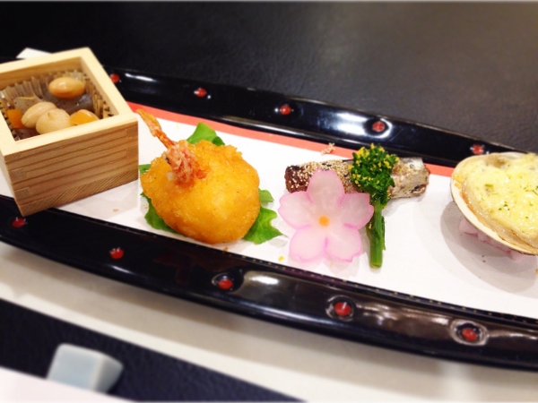 五色福豆、海老うに揚げ、蛤黄金焼き、桜餅、菜の花山葵漬け、福砂玉子、花大根というラインナップ。