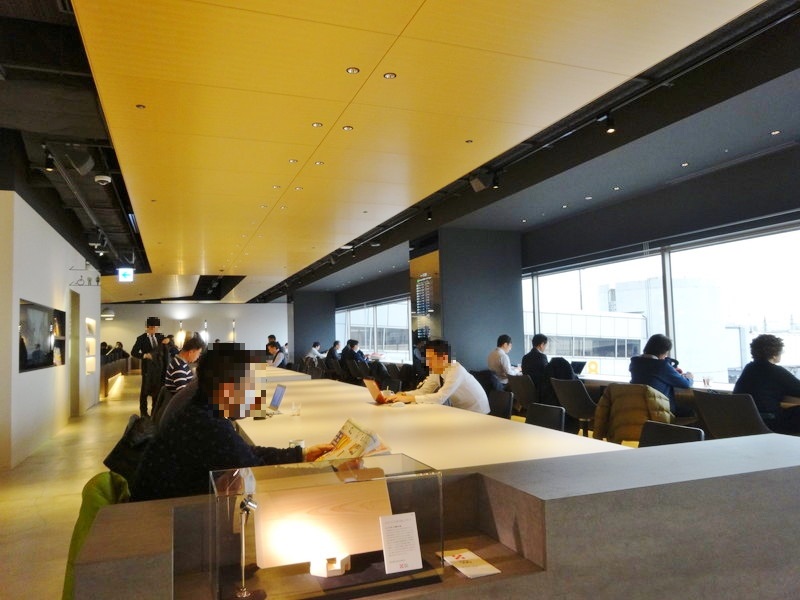 広いスペースに大きなカフェ風テーブルがあったり、個別のソファや窓際のカウンター席があったりと変化にとんだオシャレなラウンジです。