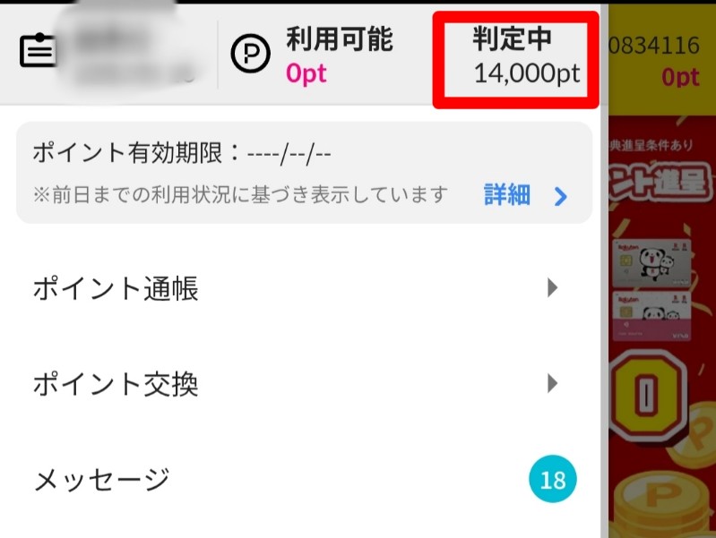 結果、14,000ポイントが『判定中』に(=条件達成後に承認される見込み)。