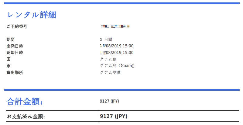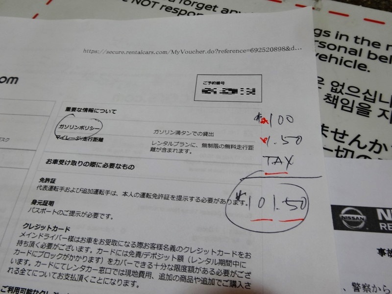 これが実際に借りたレンタカーのWEB上の領収書です。決済は事前に日本で済ませているので、当日の決済はデボジットの100ドルをクレジットカードで預けるだけ。