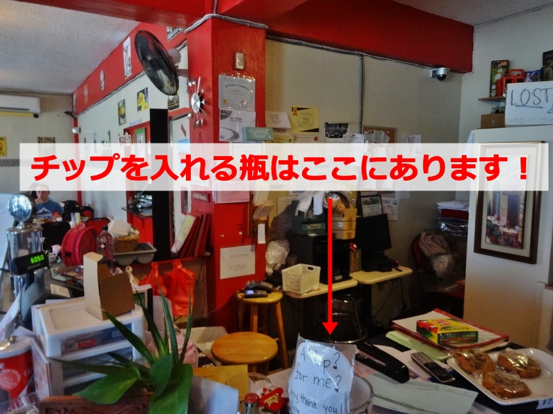 結論から言うとチップは含まれていません。ですが、レジの脇にチップを入れる瓶が準備されていますので、その中に任意の金額(10~15%程度でよいかと)を入れて帰りましょう。