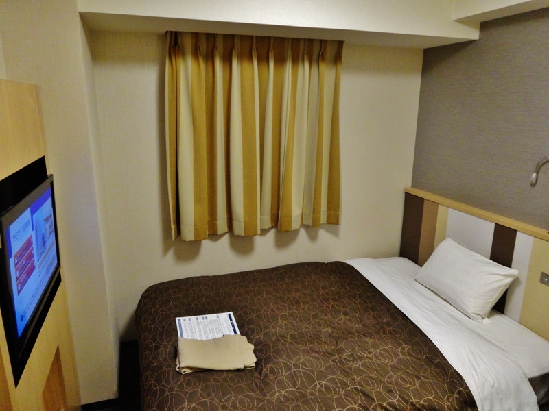 今回利用させて貰ったのはシングルルームの1泊。料金としては朝食付きで¥8,000-(税抜)でした。部屋の作りとしては写真の通り、ベットが部屋の中央に配置されデスクが壁側。TVも壁掛けで小さいスペースながら広く使えるように工夫されていました。