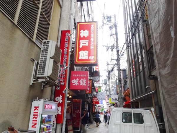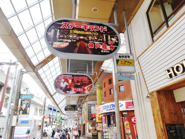 神戸・三宮駅から西へ徒歩3分程度で到着します。駅を出ればほとんどすぐ到着する印象ですね。線路北側の商店街(アーケード屋根あり)をあるくとドデカイ看板があるので迷うことはないと思います。