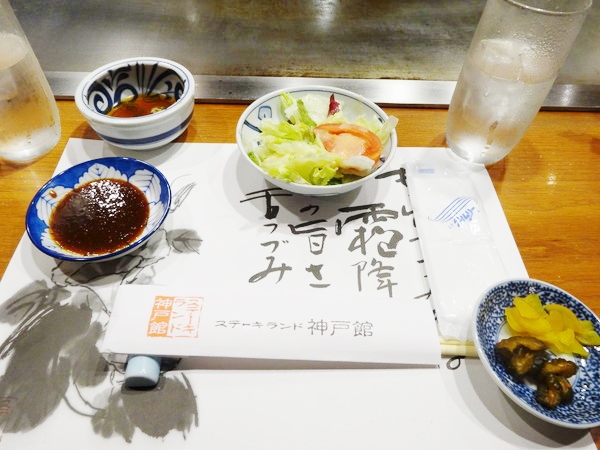 まずは鉄板で焼かれる神戸牛と焼き野菜以外が配膳されてきました。