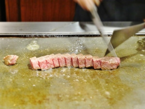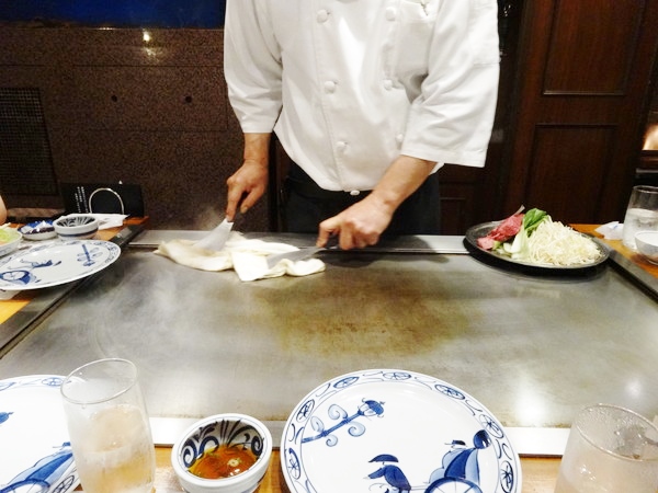 目の前でシェフによる鉄板焼き開始。手際がよく、エンターテイメントとしても楽しめます。