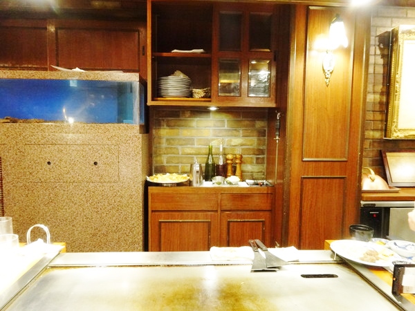 店内に入店です。一つの鉄板を7人が囲むスタイルで、店内には鉄板がいくつもあります。そこにシェフがやってきて、次々と焼いていく形式のようです。