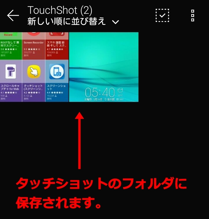 さて、キャプチャー画像はどこに保存されるのか?答えは簡単です。カメラなどで撮影した際に保存される場所(ギャラリーなど)に新たにタッチショットのフォルダが作成されており、そこに保存されています。