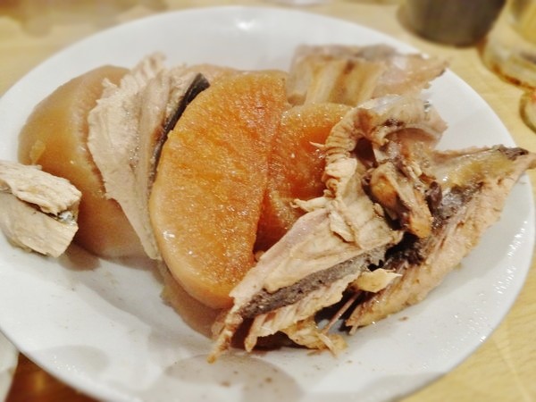 続いてアラ大根です。ゴロゴロとあらと大根がてんこ盛り。大鍋で調理されたアラ大根が皿にごっそり盛られます。